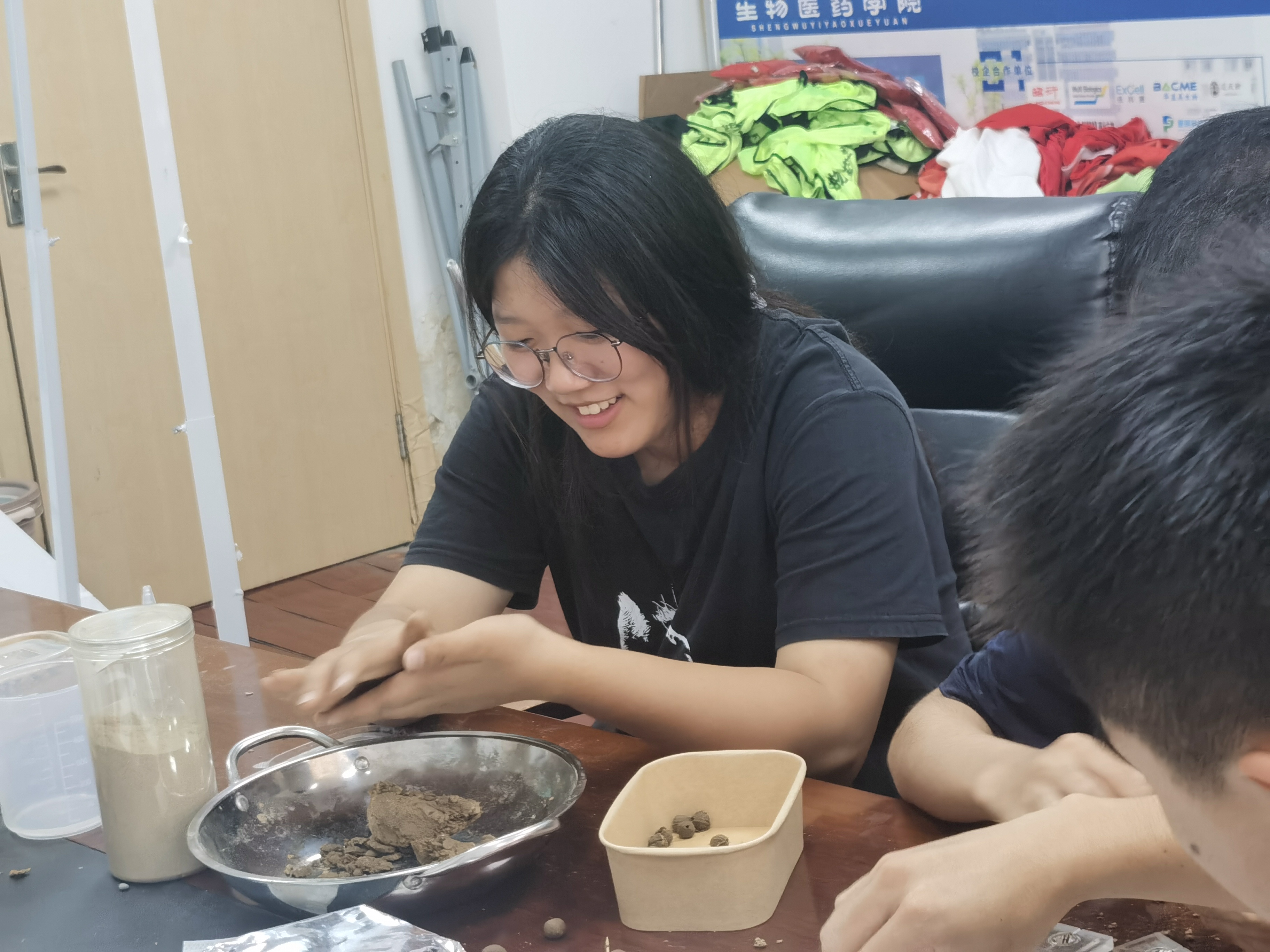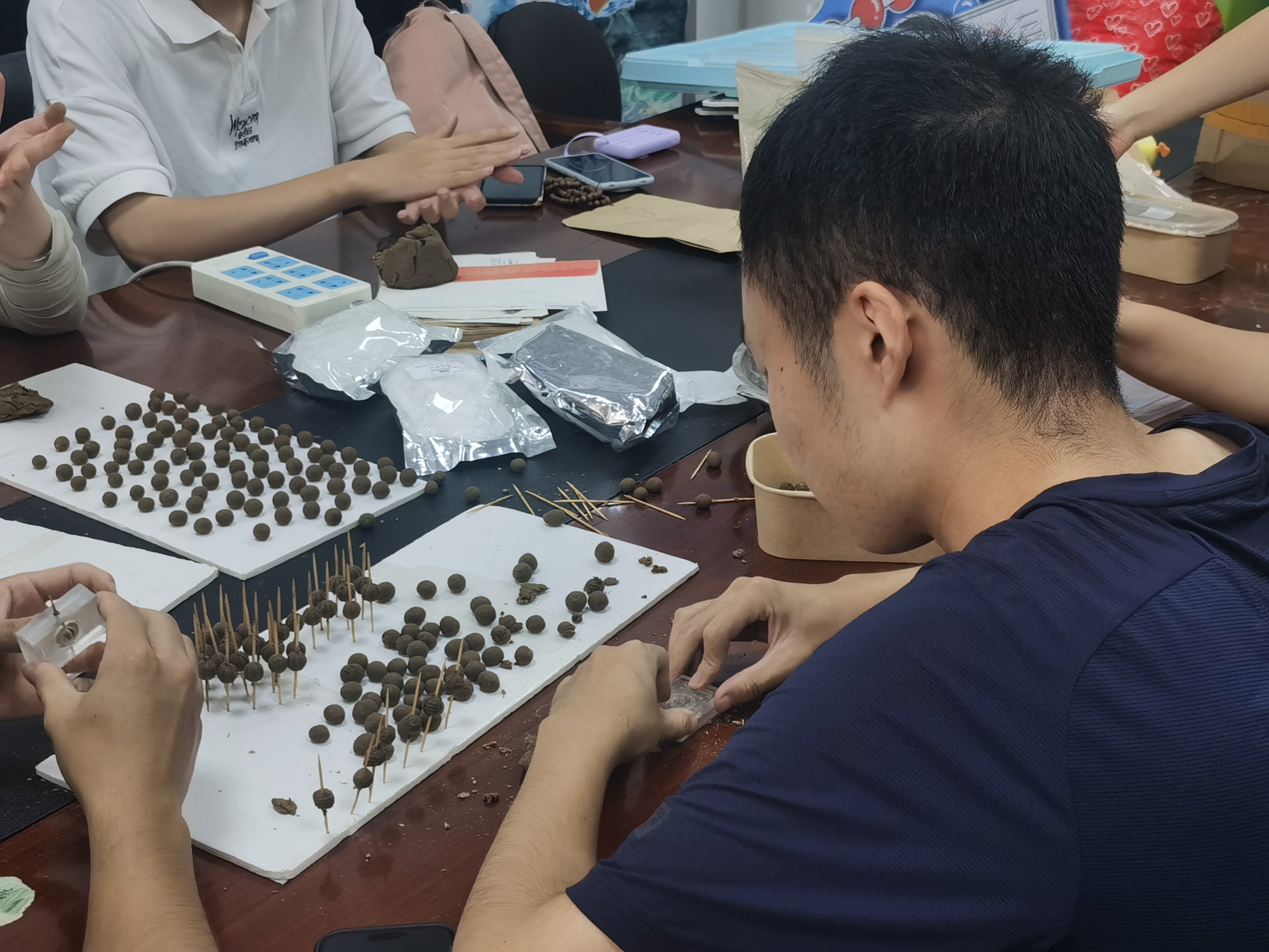 活动现场,学徒们化身“小药师”,称取适量药粉,混合均匀后加入粘合剂,在药香浸润中把手中的“大药丸”搓成一个个大小一致、均匀等重的小药丸,并在其中留下后续穿绳用的孔洞后,等待阴干再制成适合自己手腕大小的中药手串,在入秋之际带给自己一份温柔的中药滋养。