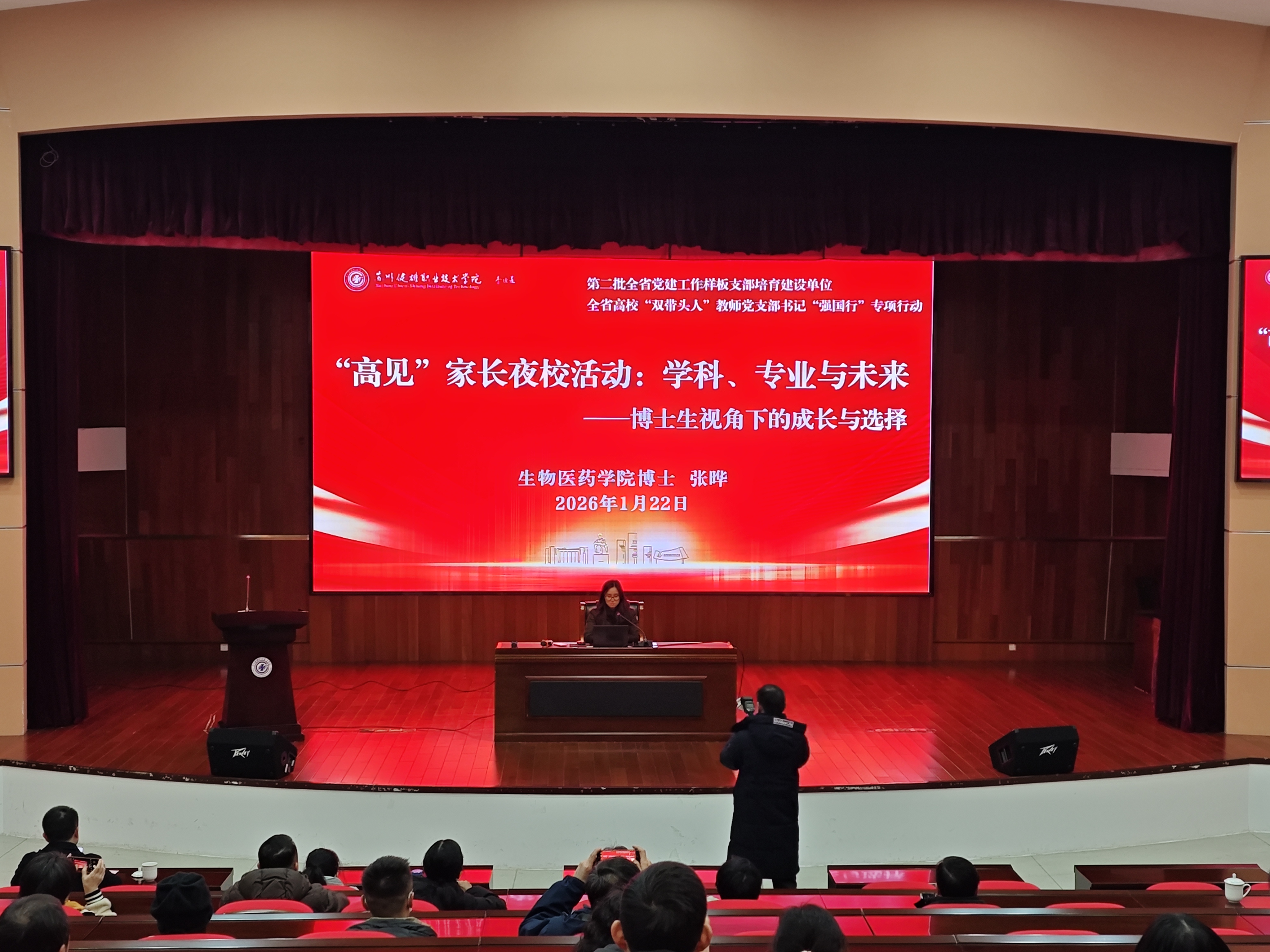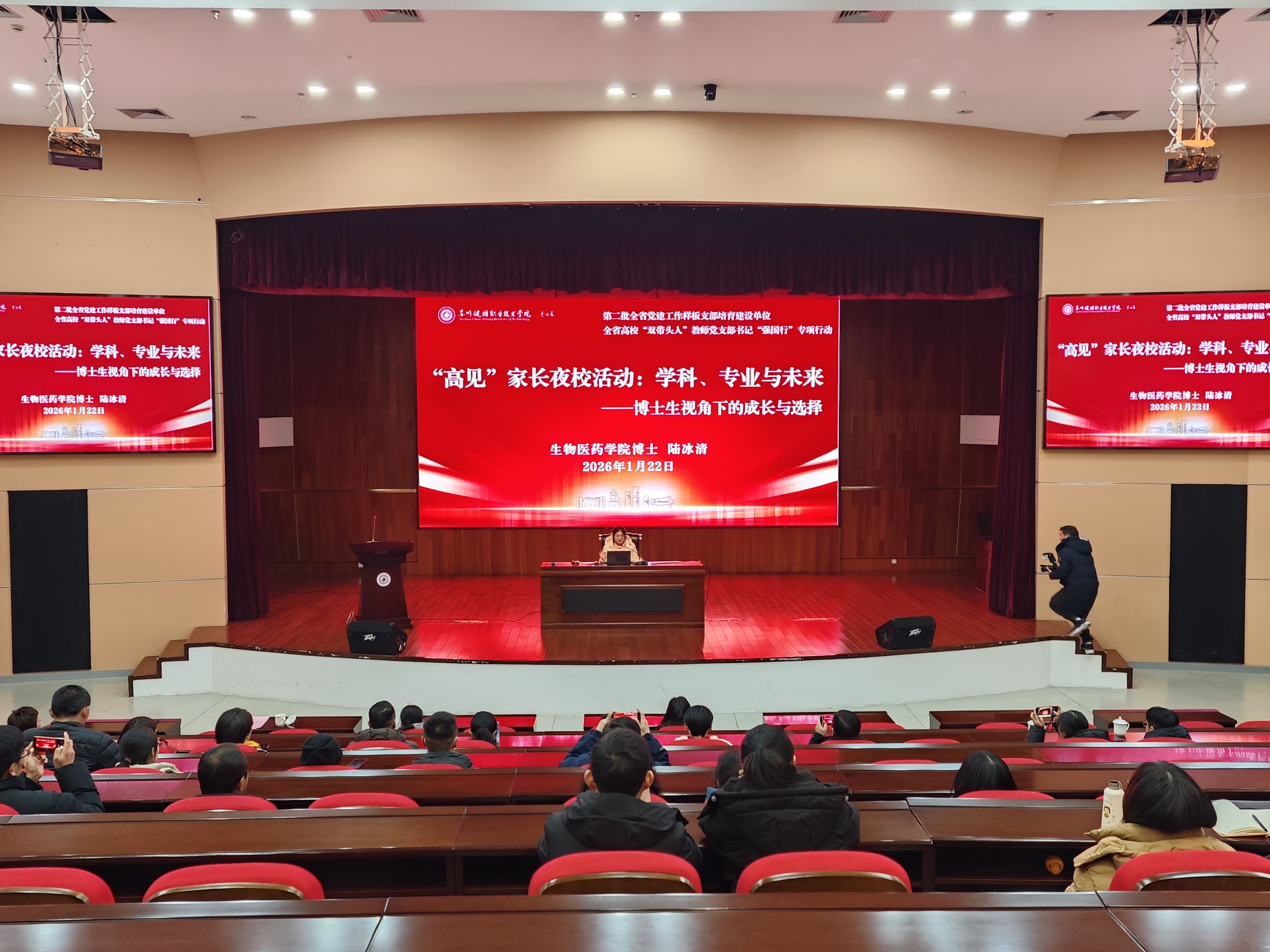 1月22日,江苏省太仓高级中学“高见”家长夜校活动在我校东校区报告厅举行,博士党员先锋队成员陆冰清、张晔受邀参加。两位博士党员围绕个人成长经历、学生核心素养、学科动态与发展前景等方面为现场近百名家长送上了一场兼具专业理论深度与实践指导意义的主题报告,并聚焦高中学生的学业规划、专业选择和能力培养等内容为家长答疑解惑,提出意见建议。