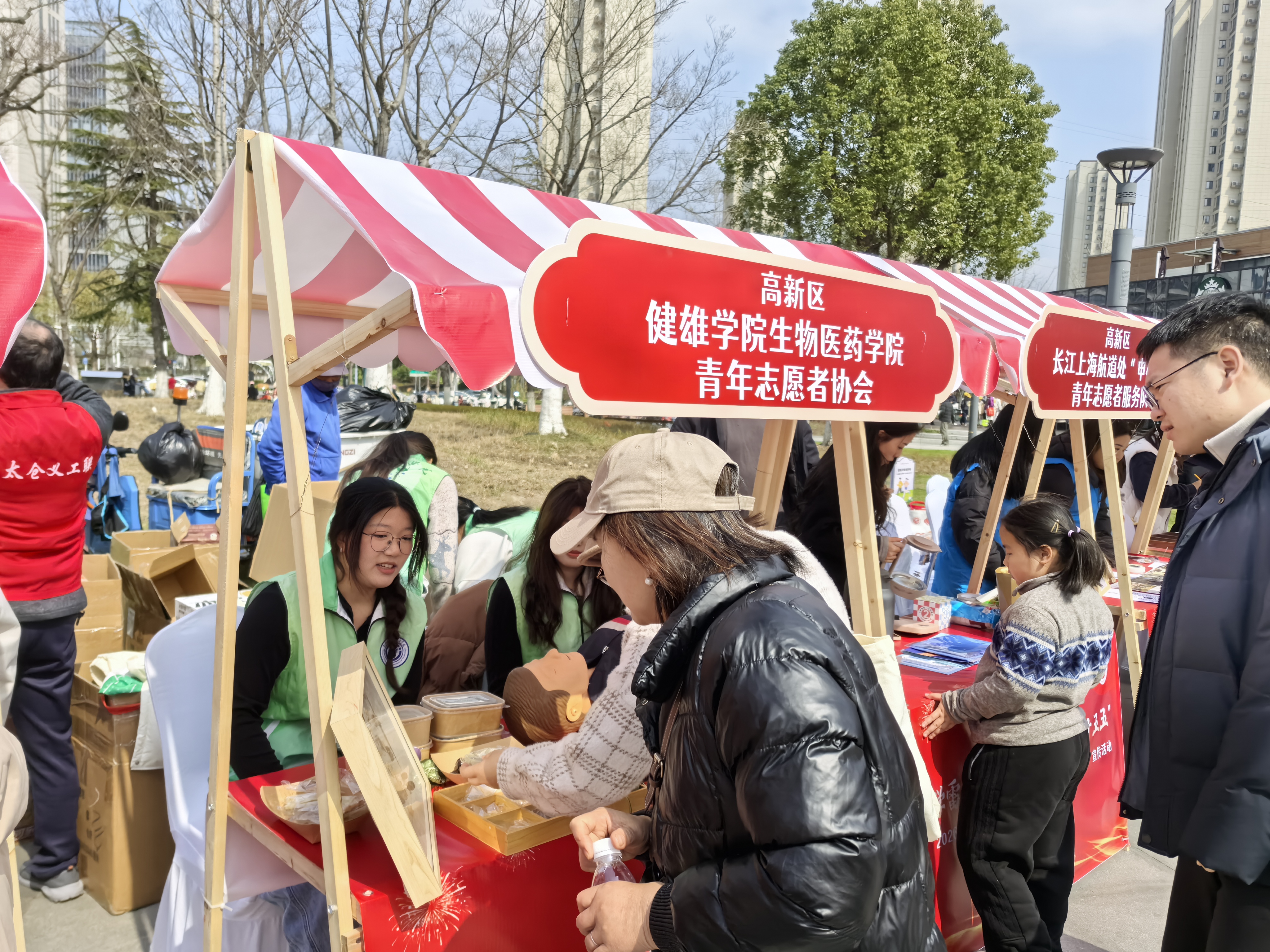 太仓市学雷锋主题志愿市集上,学院中药养生摊位人气十足。志愿者们现场陈列常见中草药,用通俗直白的语言拆解日常养生秘诀,同步提供养生茶品鉴、手工香囊制作体验及健康咨询服务。以专业学识搭建便民桥梁,让中医药文化在志愿服务中落地生根,市民在轻松逛市集的过程中收获健康干货与春日暖意。