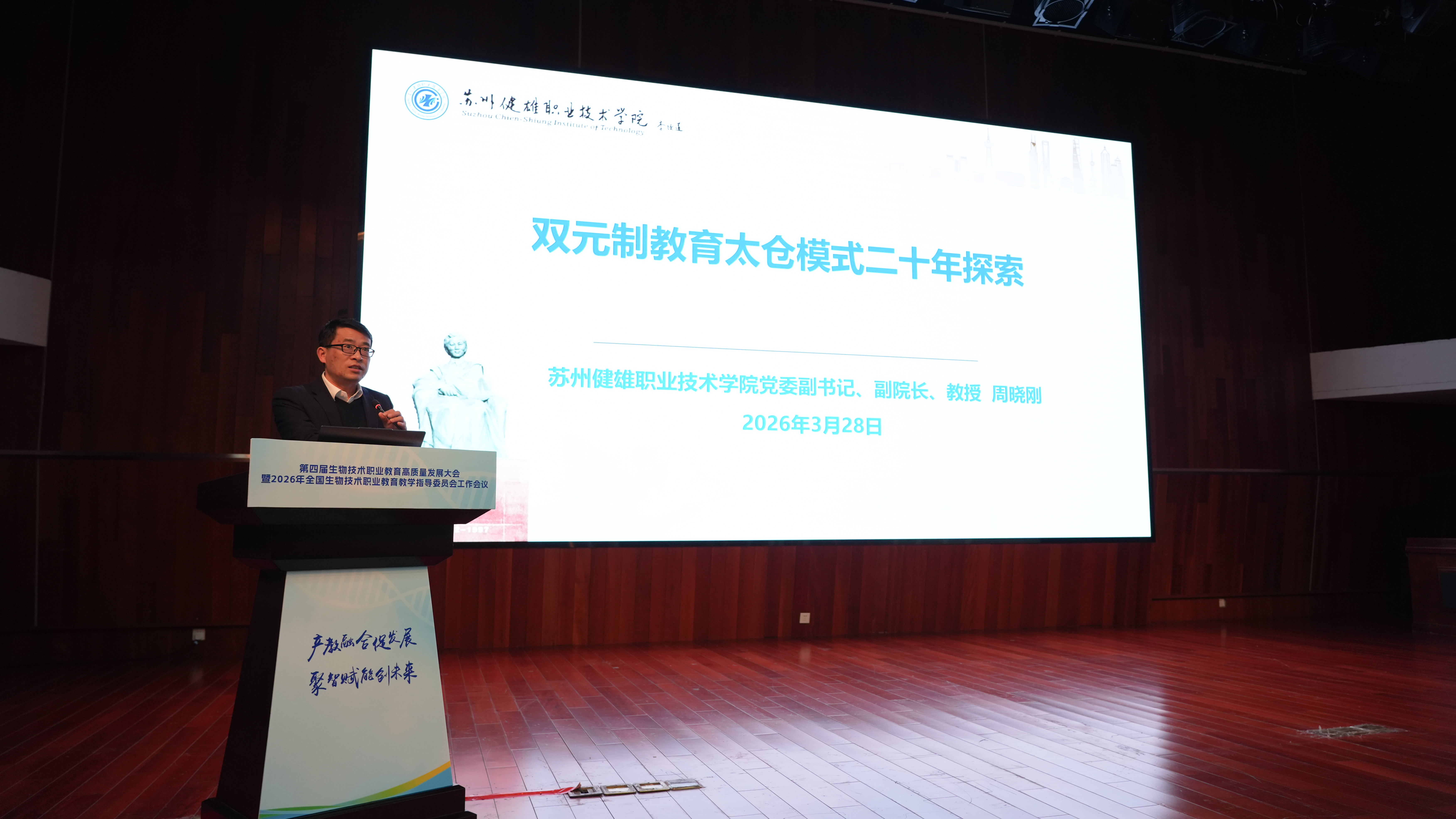 陈羔在会上致辞。他说,当前,太仓正深入学习贯彻习近平总书记在参加十四届全国人大四次会议江苏代表团审议时的重要讲话精神,立足“现代田园城、幸福金太仓”的城市定位,全力谱写中德合作、融入上海、以港强市、城乡和美“四篇文章”。此次大会在苏州健雄职业技术学院举行,既是对太仓生物医药产业和产教融合发展的高度认可,也为苏州和太仓的高质量发展增添了新的活力。太仓始终把职业教育摆在服务区域发展的重要位置,依托三十余年对德合作深厚底蕴,以苏州健雄职业技术学院为核心载体,深耕“双元制”教育本土化实践,构建起“政府统筹、校企双元、多方协同”的职教发展生态。希望各位专家充分发挥视野广阔、学识渊博的优势,为我们深入把脉、精准指导、鼎力献策,共同为生物技术职业教育高质量发展贡献智慧力量,为加快培育和发展新质生产力、推进中国式现代化太仓新实践注入强劲动力。