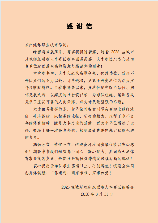 近日,2026盐城市足球超级联赛大丰赛区赛事圆满落幕,我院学子刘智鑫代表大丰代表队出战,凭借出色表现助力球队斩获佳绩,为学院争光、为学校添彩!